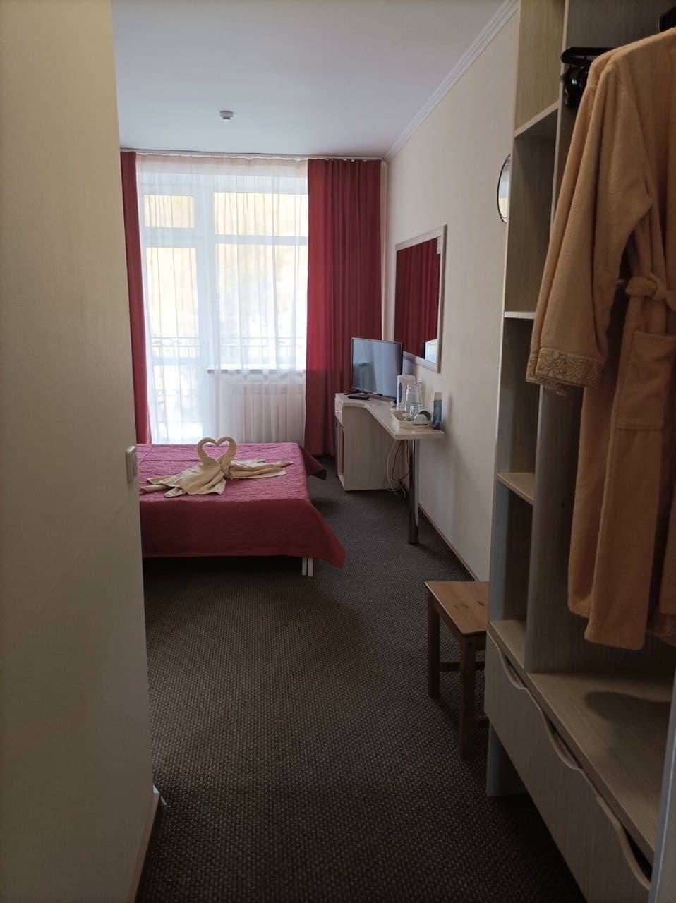 Уютный однокомнатный номер. Классический интерьер, мягкие теплые тона создают атмосферу покоя и комфорта. В номере имеются: полутораспальная кровать, шкаф, тумбочка, стулья, вешалки для верхней одежды, холодильник, телевизор ЖК 32 дюйма, чайник, фен, санузел (душевая кабина), прихожая зона.